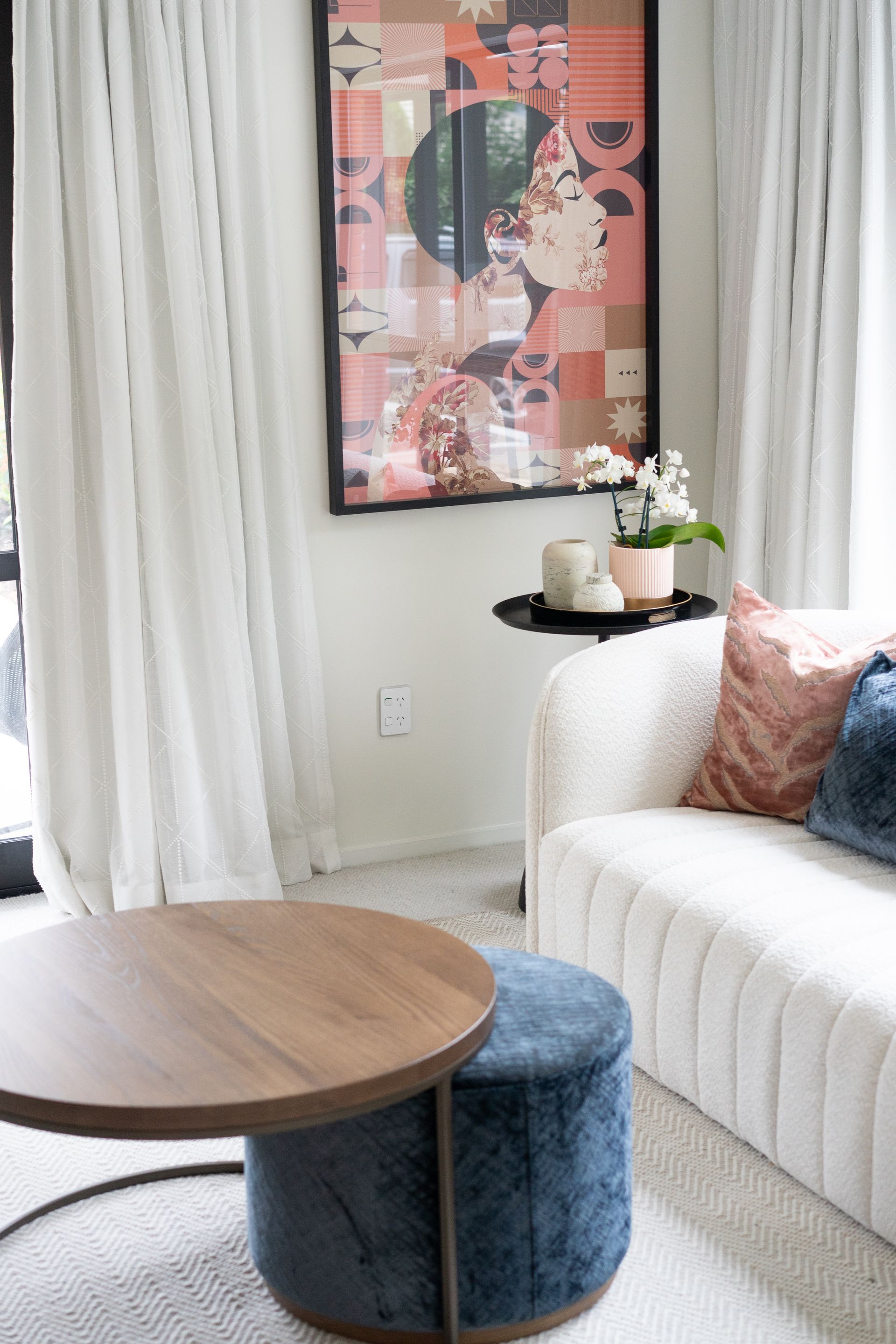 We have loved working on this modern glam townhouse in a leafy part of the city. We are nearing completion of the downstairs and wanted to update you with a few pics of some bespoke furniture pieces added to the living room and of course the fabulous outdoor space with brand new custom squabs and colourful cushions made at our in-house manufacturing studio.