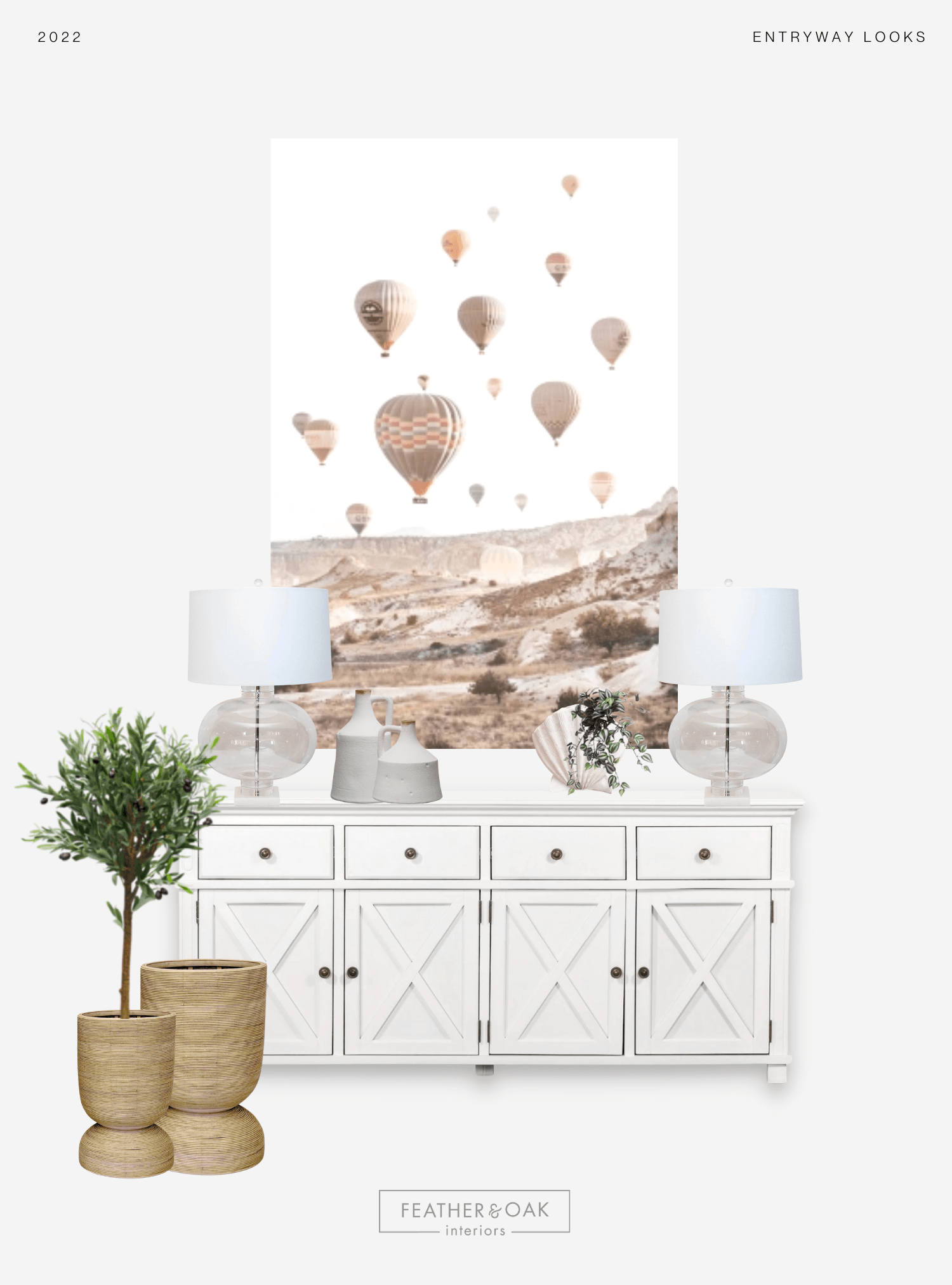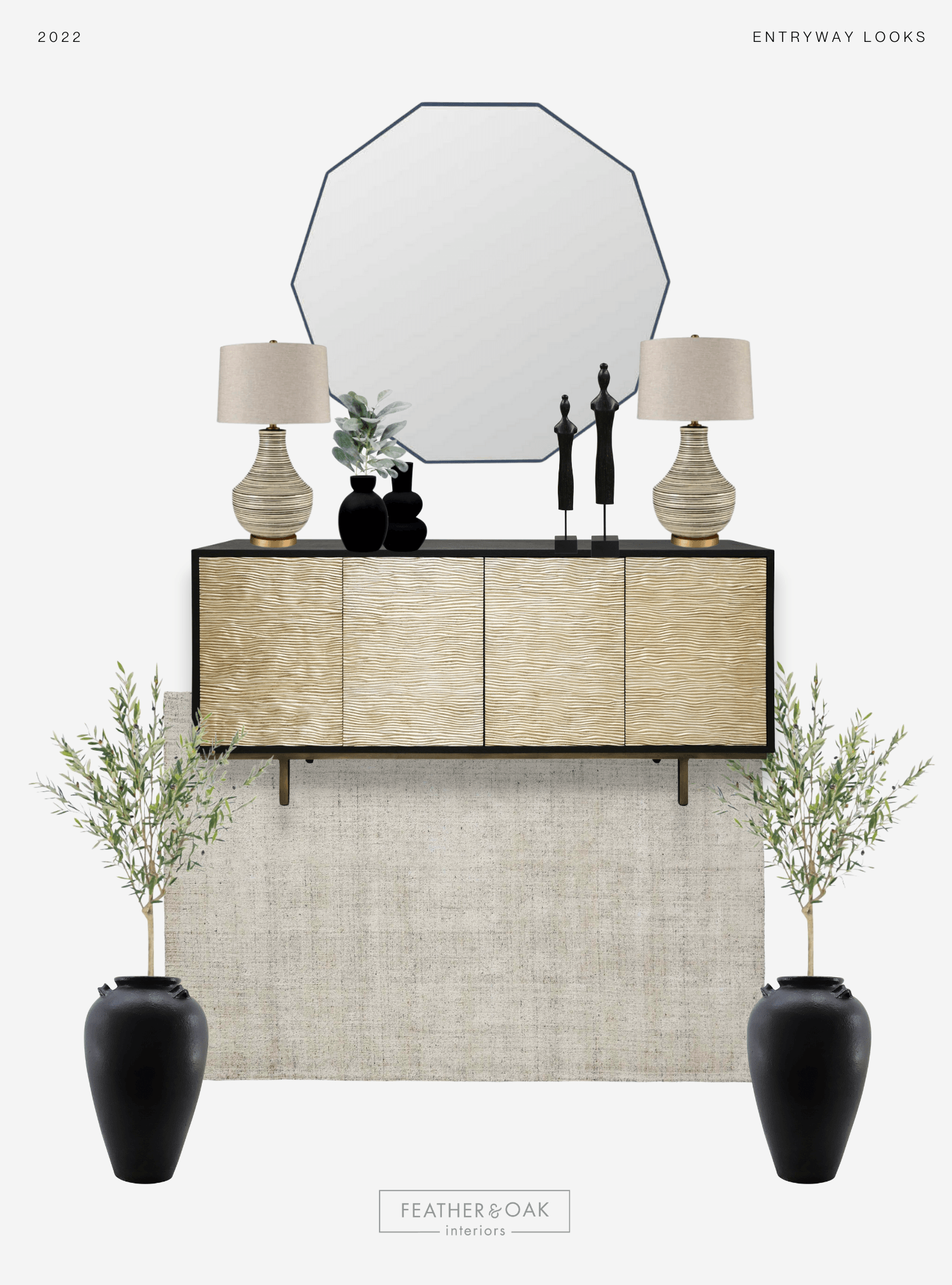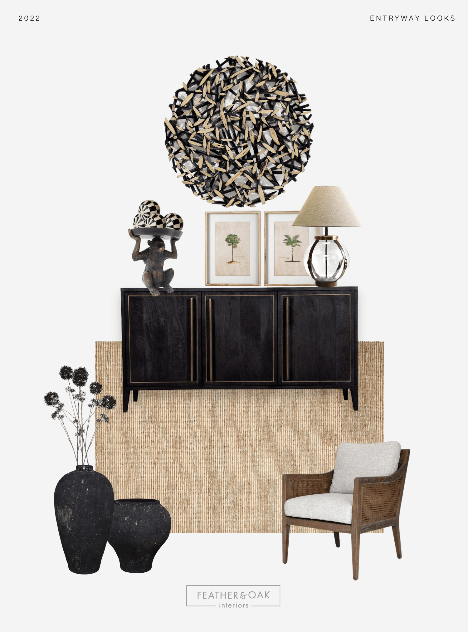 Last but not least - our favourite part - the finishing touches. Bring your final entryway look to life with functional storage pieces like textural baskets for shoes and throws, small trays or bowls for keys, and thoughtful decorative details like sculptures, candles, stacked books, a little greenery, and frames to fill out any gaps. It's important to consider the colour, line, texture, and scale of decorative elements and incorporate a variety to give your entryway that "wow" factor.