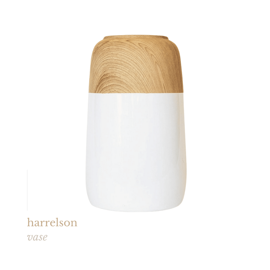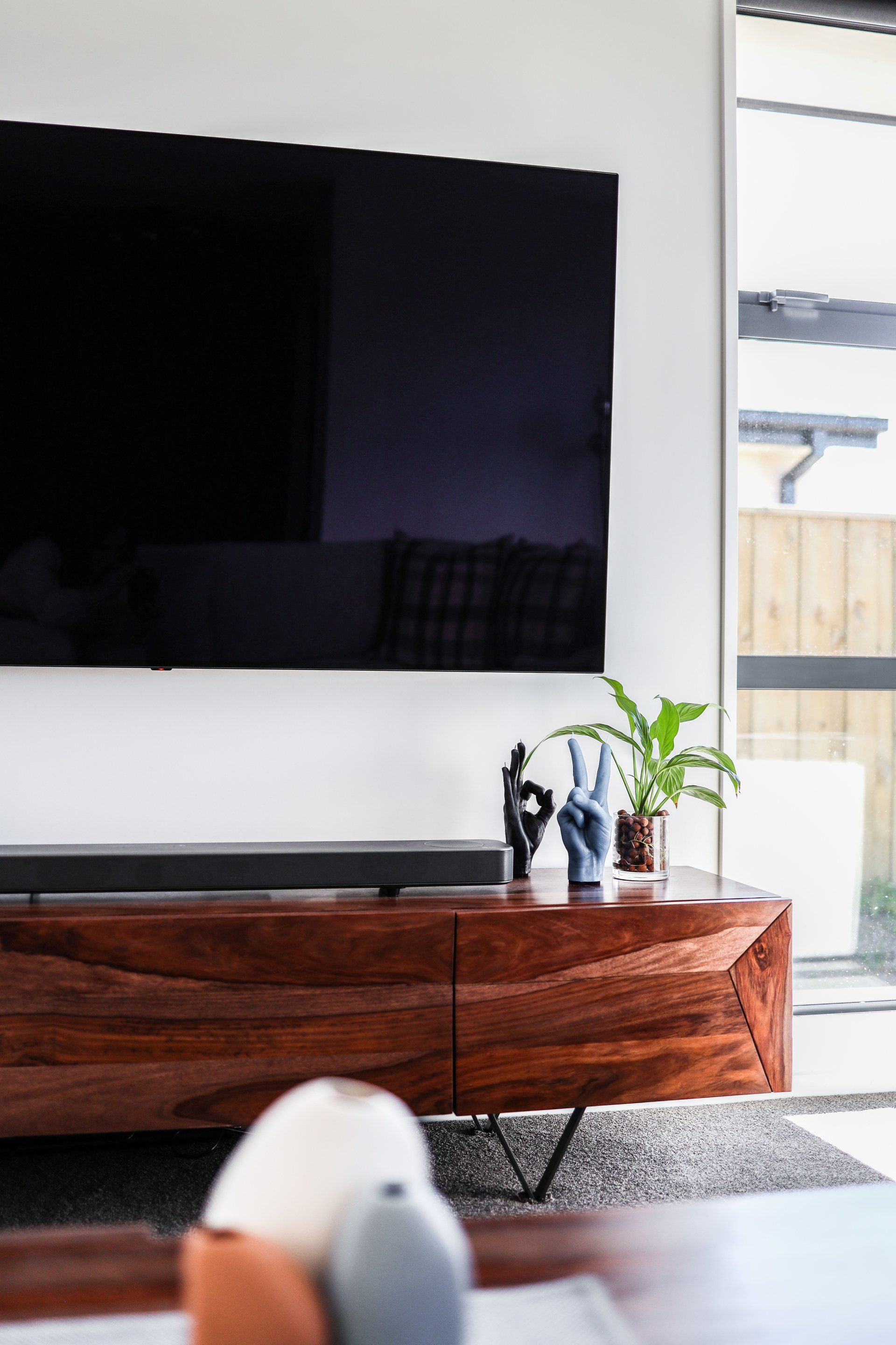 We chose a comfy corner sofa from Freedom Furniture that wasn't too high so that when you entered the lounge so that it still felt open and spacious. The light grey goes perfectly with our new curtains and provides a nice contrast with our dark carpet. It also came with an ottoman that has storage space inside for our ever-growing collection of board games! We fell in love with the Wyatt furniture collection due to the unique tones of the Sheesham timber. We placed a leather occasional chair in the corner to help make the space more conversational and provide some warmth to our colour scheme. We chose the Gum Leaf print because of its simplicity and to introduce some blue into the space - it was also the perfect size for the wall! We decided to mount the T.V on the wall to also help the area feel more spacious. We also have a couple of lamps with the same smokey glass to tie in with the entrance and kitchen pendants.