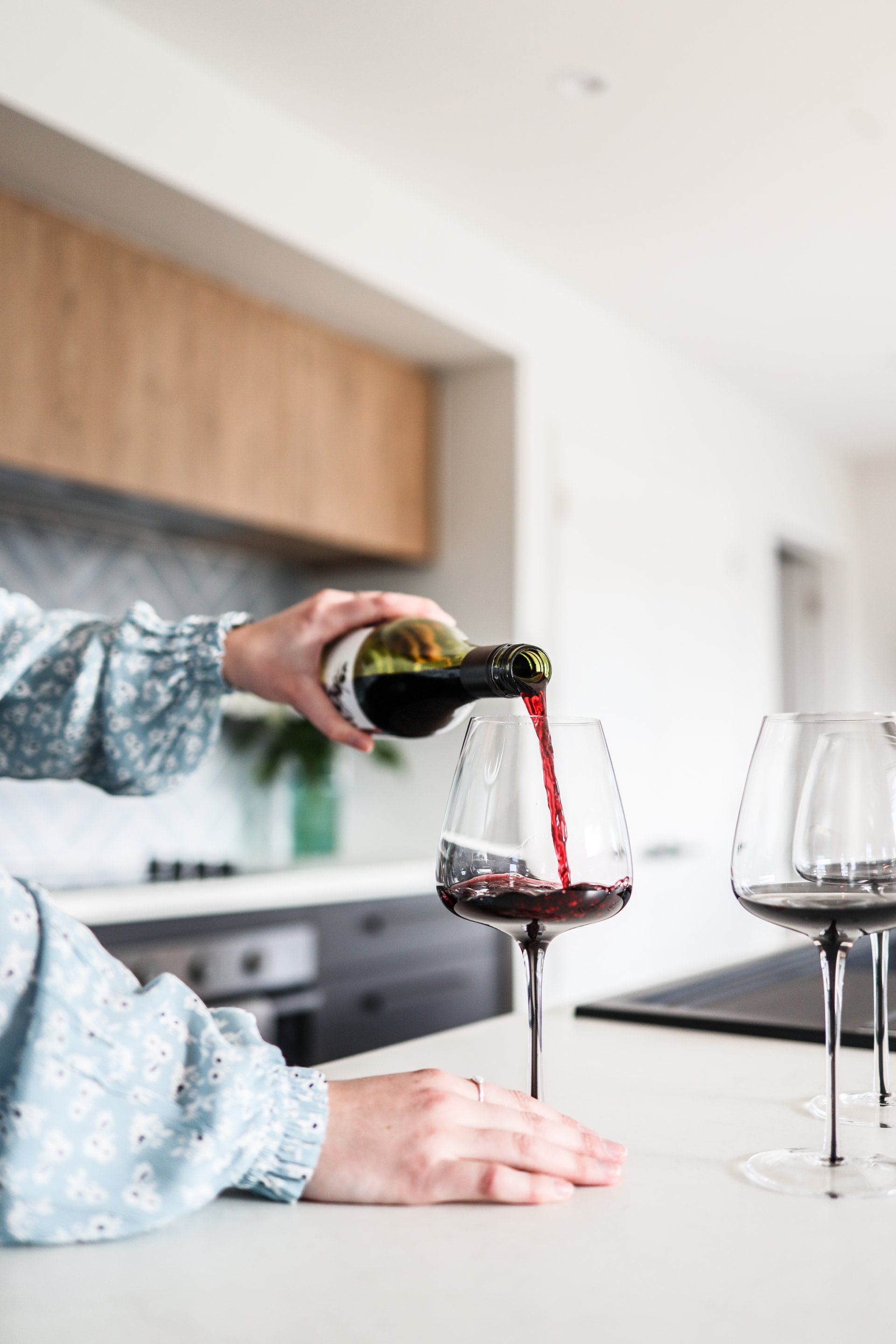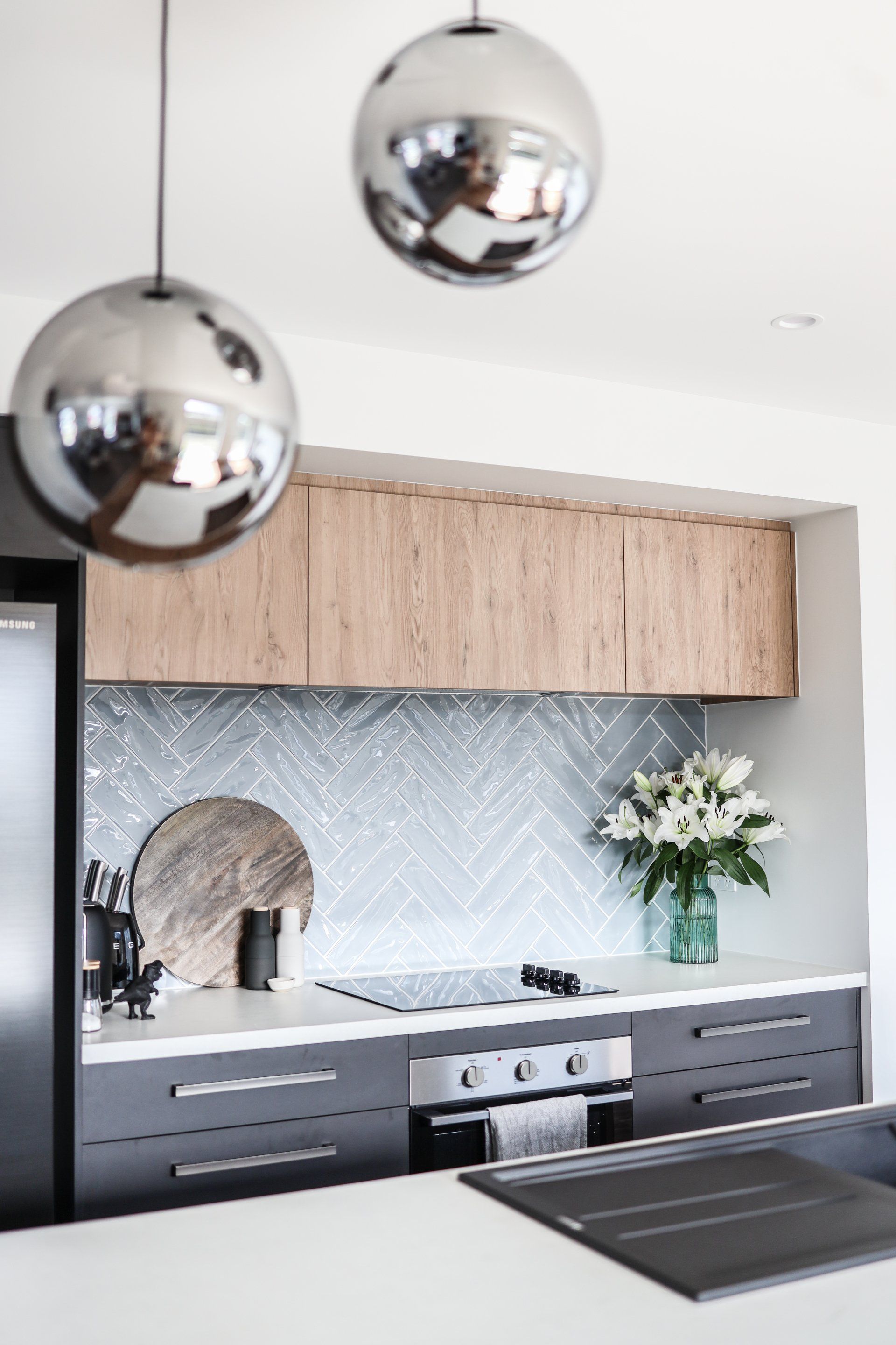 As you enter the kitchen, the main feature is our smokey glass pendants, mounted to the side of our island bench for something a little different. Our herringbone tile splashback provides a soft pop of blue which we have paired with charcoal grey and light oak cabinetry, alongside our sexy black fridge which is also quite a feature! We have found the layout of our kitchen works really well for us and having the walk in pantry is great! We extended the floor space between the island bench and the outer wall so that our living area feels more open and spacious - it's also a good space for guests to mingle at dinner parties!