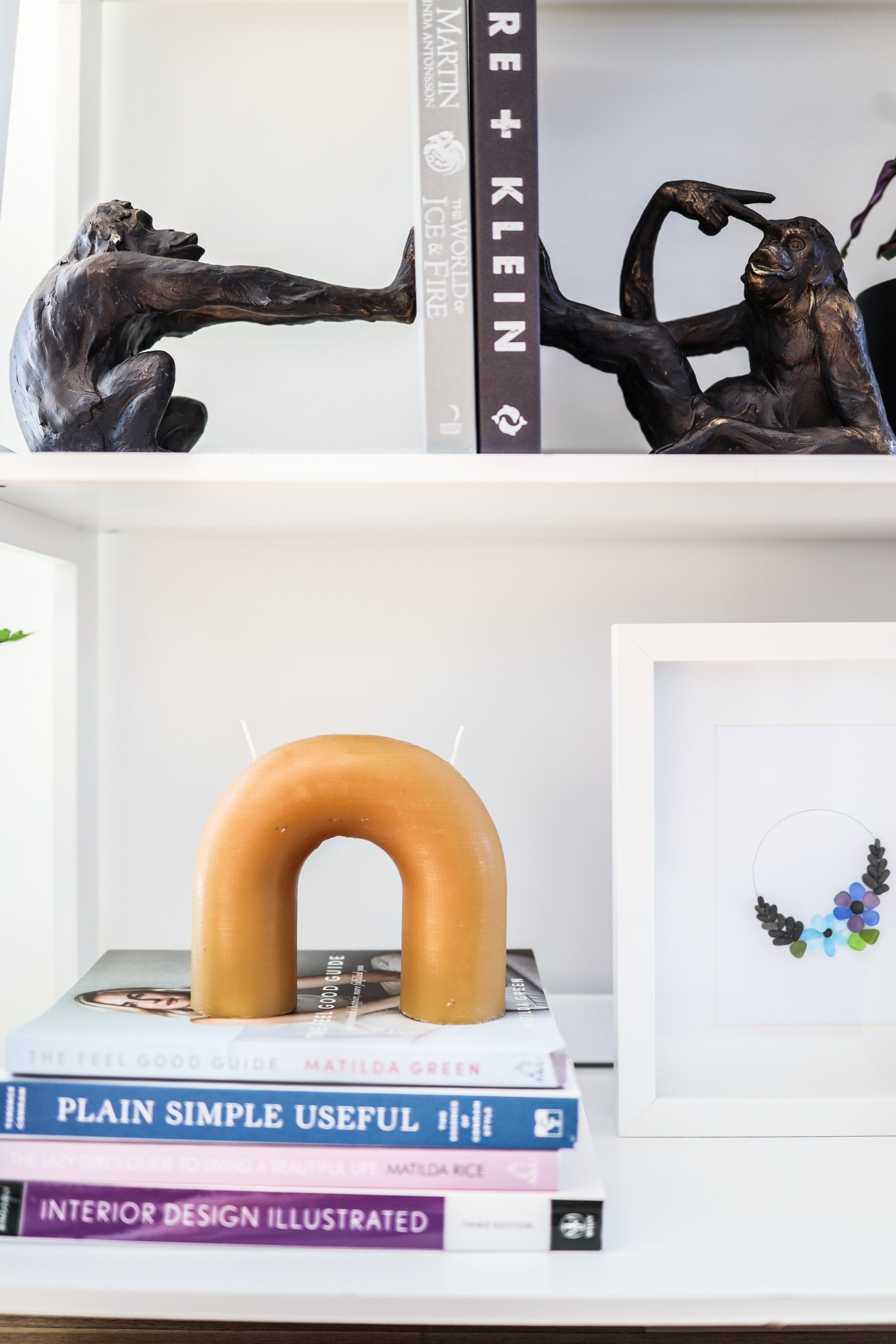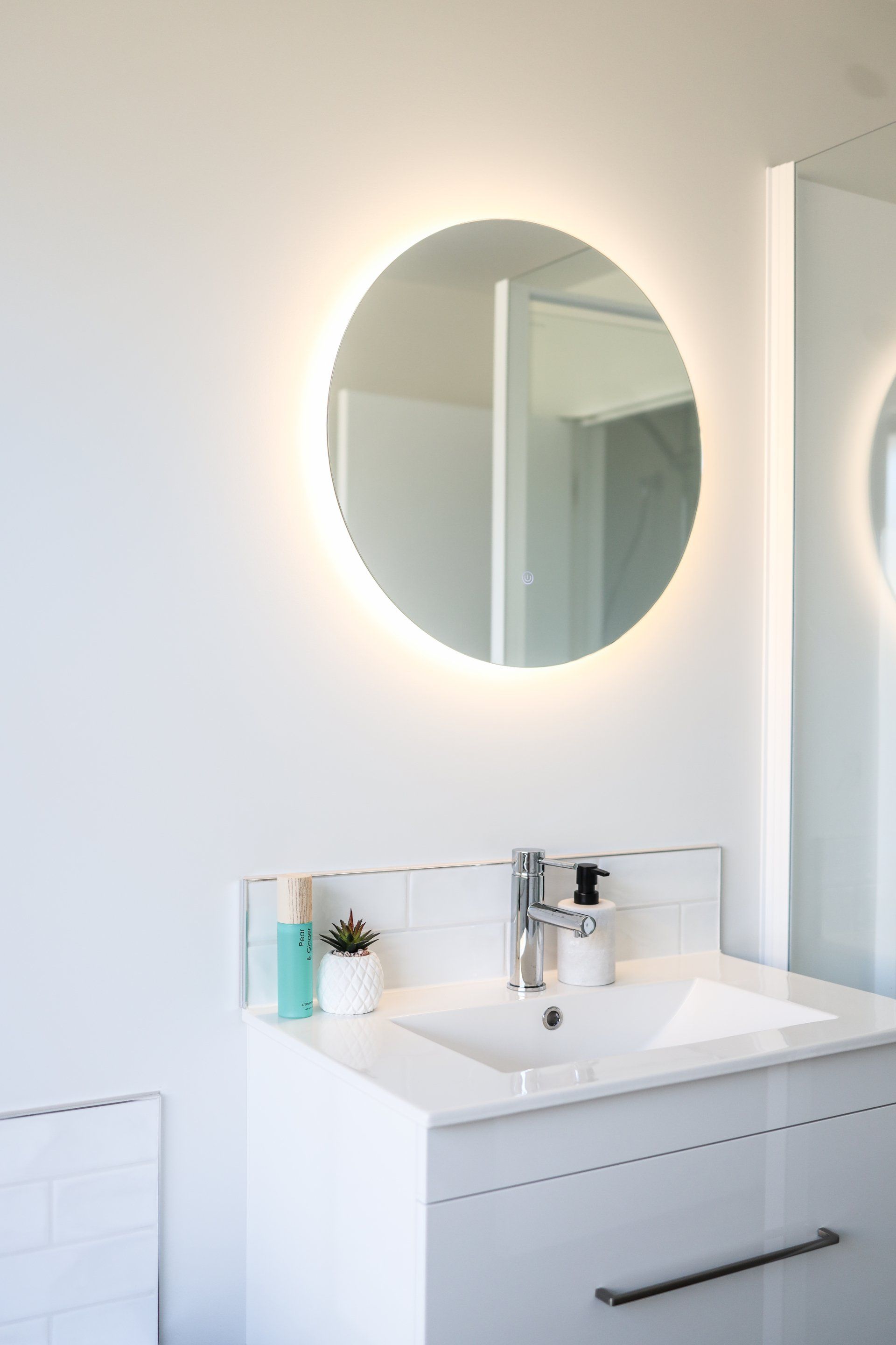 We kept our bathroom and ensuite fairly simple as we decided to spend our money elsewhere in the home. Both are really light and and bright during the day thanks to the large windows and the white textured tiles match our kitchen splash back to provide some flow throughout the home. Our round back lit mirrors are the main feature in both the bathroom and ensuite. They are super cool because you can brighten and dim the light which also changes colour! I plan to eventually add some fun artwork and a couple plants for a pop of green.
