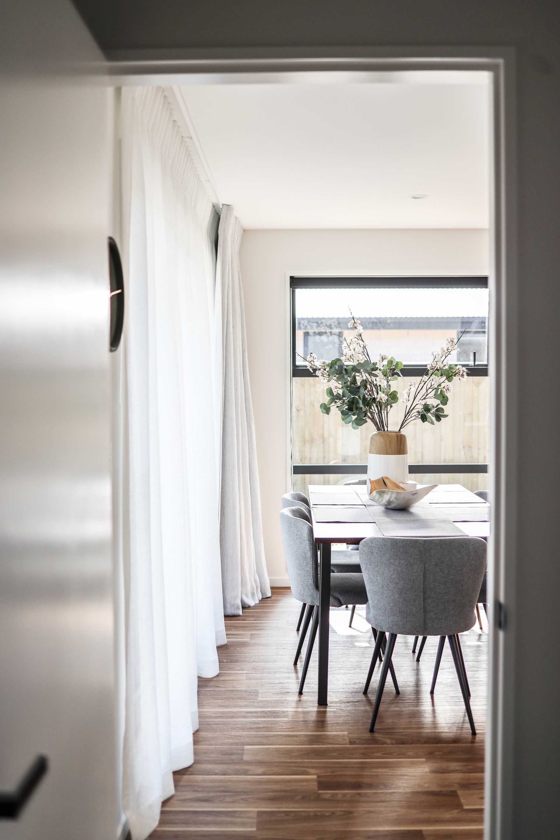 Our dining table is also from the Wyatt collection to tie in with our lounge furniture. We like the contrast of the darker wood with our light flooring and kitchen cabinetry colours. We were initially a little worried about the table fitting in the dining area as there's not a lot of room, but luckily it fit perfectly! Our beautiful double track curtains add a lovely relaxed feel to the space and in summer we can open the sliding door to create an indoor and outdoor dining/entertainment area.